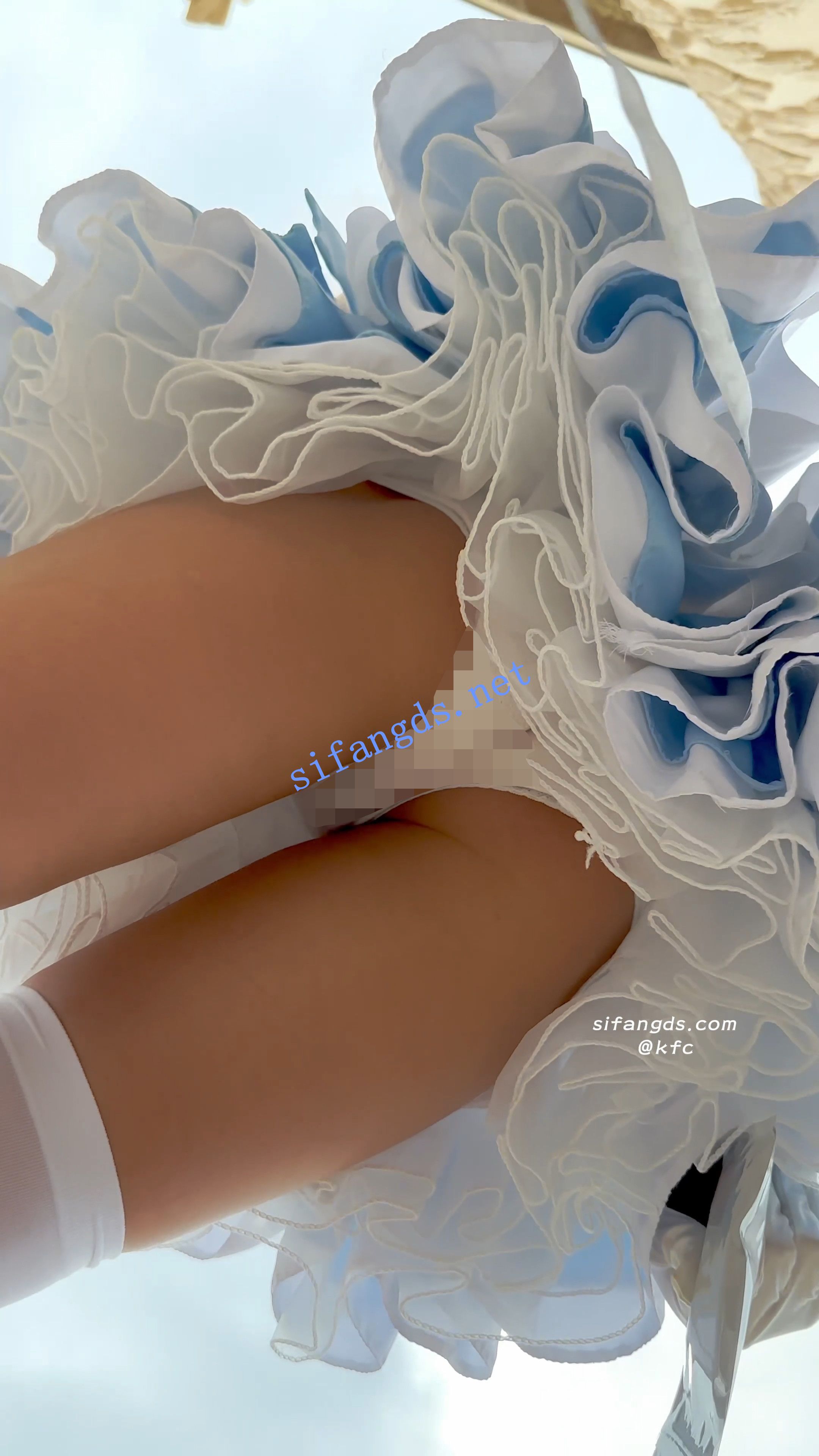 官方售价36元❤️警惕性超强的美女穿着超短蓬蓬裙根本捂不住浅紫色和白色的格子内蕾丝边带翅膀屁股两侧有点黑